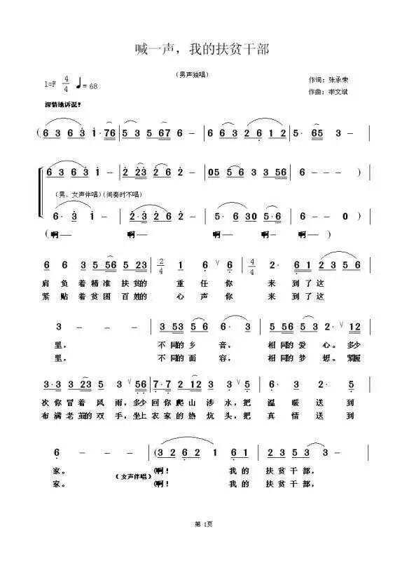 歌曲《喊一声,我的扶贫干部》是由陇南张承荣作词,全国著名作曲家、武警西藏总队政治部文工团团长李文斌先生谱曲,省内知名青年男高音歌手张康宁演唱的一首讴歌精准扶贫、赞美扶贫干部的歌曲。