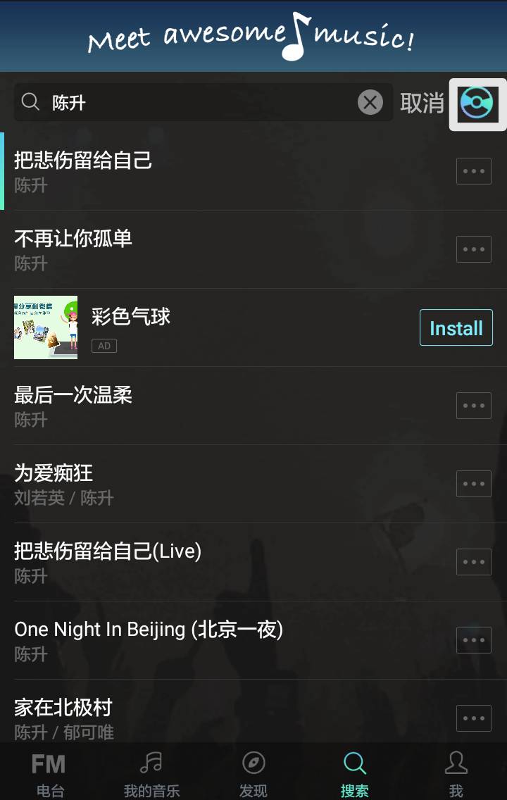点击白色方框圈定的“搜索”栏,直接键入陈先生的名字,就能找到他的歌曲列表了(应用里有广告,自行忽略