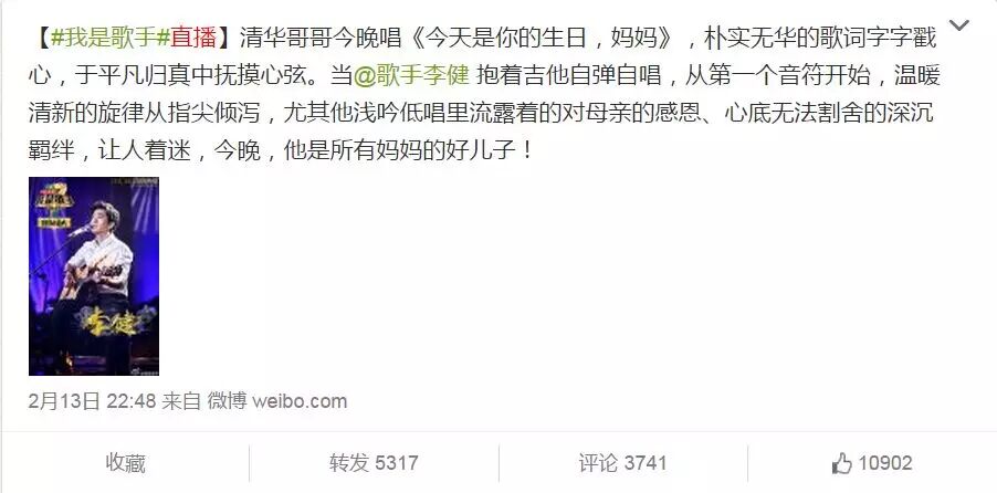 夸李健,“所有妈妈的好儿子”、“新年度最动人的心灵诗歌”、“拥有逆流之美的音乐诗人”;