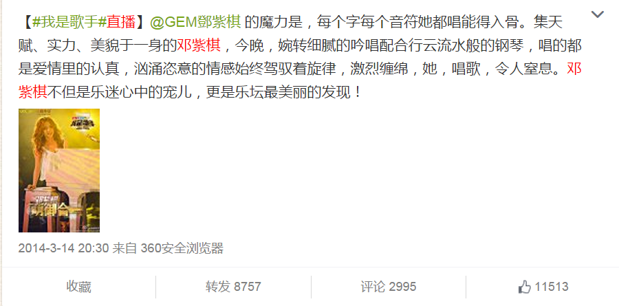 夸邓紫棋,“90后天后”、“乐坛最美丽的发现”、“全世界都是你的歌迷”;