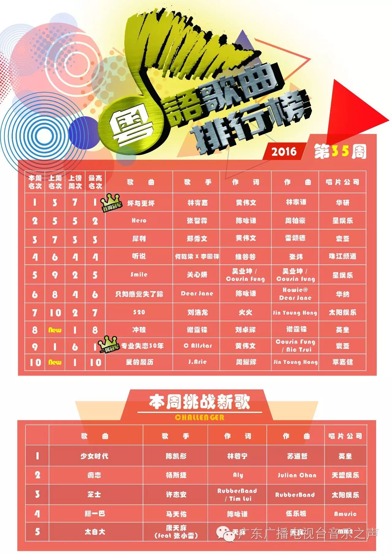 放榜日|粤语歌曲排行榜 2016年度第38周成绩:谢霆锋夺冠