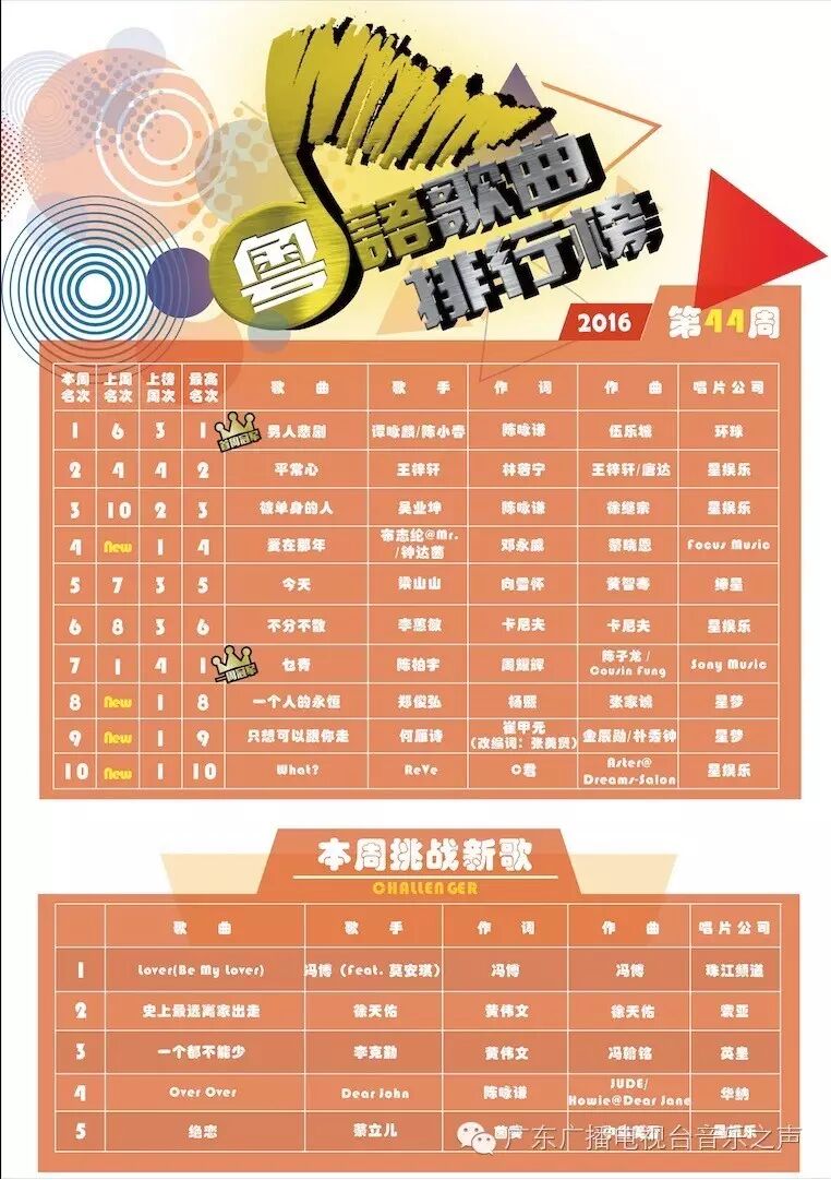 放榜日|粤语歌曲排行榜 2016年度第44周成绩:谭咏麟、陈小春夺冠!
