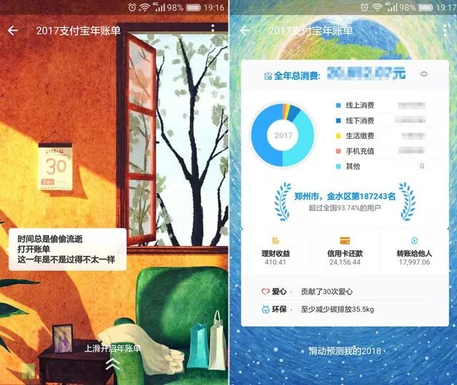 时间总是偷偷流逝,2017年我们过的怎么样,没等我们总结,支付宝年度恐怖账单已为你透视出来,除了网购消费、线下支付,还包含出行、公益、环保等多个方面,基本上涵盖了生活的方方面面,更令人想不到的是,它还能预测你的2018关键词。