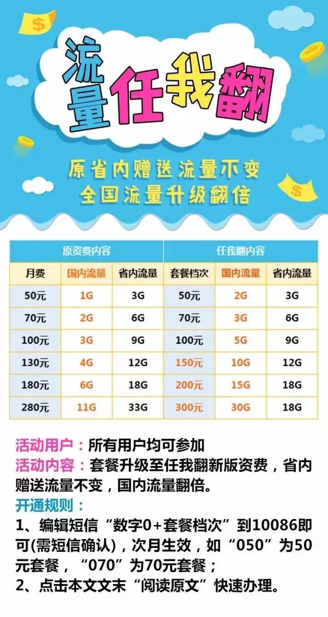 2、如果您是老版50元或以上流量套餐,现在可以升级至新版,资费不变,可以享受更多国内流量,具体看下图资费。