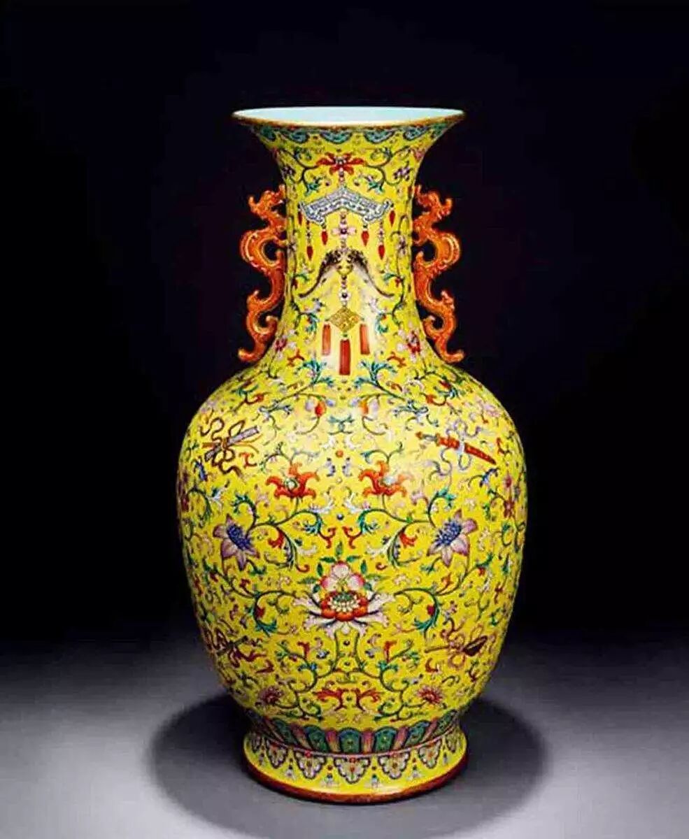 乾隆 黄地洋彩锦上添花暗八仙双龙耳瓶