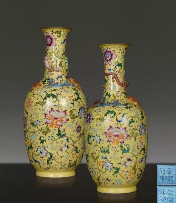 乾隆 黄地轧道洋彩缠枝西番莲塑五螭龙纹瓶(一对)