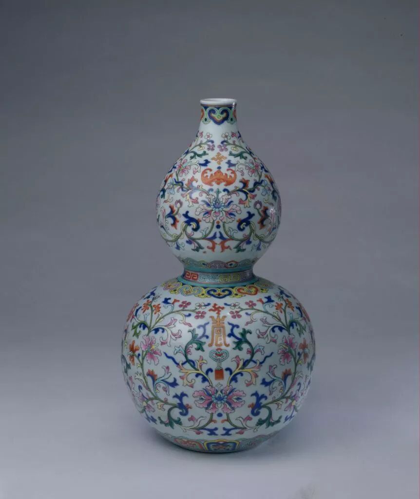 葫芦瓶通体饰斗彩缠枝莲纹,并饰红蝠、篆体“寿”字纹,象征福寿绵长。