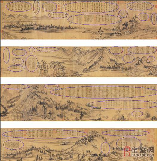 再来看看惨遭毒手的《富春山居图》,全篇被“糟蹋”55处,怪不得黄公望能被气得活过来。(还好这幅不是真迹