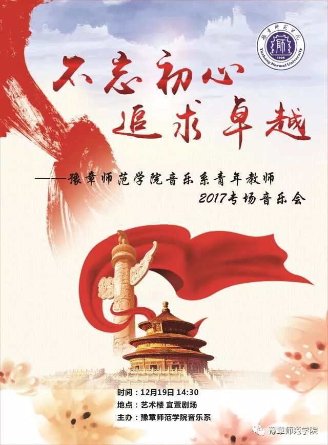 12月19日(周二)下午14:30,由豫章师范学院音乐系举办的“不忘初心 追求卓越”青年教师专场音乐会将在艺术楼宜萱剧场盛大开幕啦!这场音乐会汇集了校内优秀音乐人,共同为全校师生奉上一场视听盛宴,让我们一起期待吧!