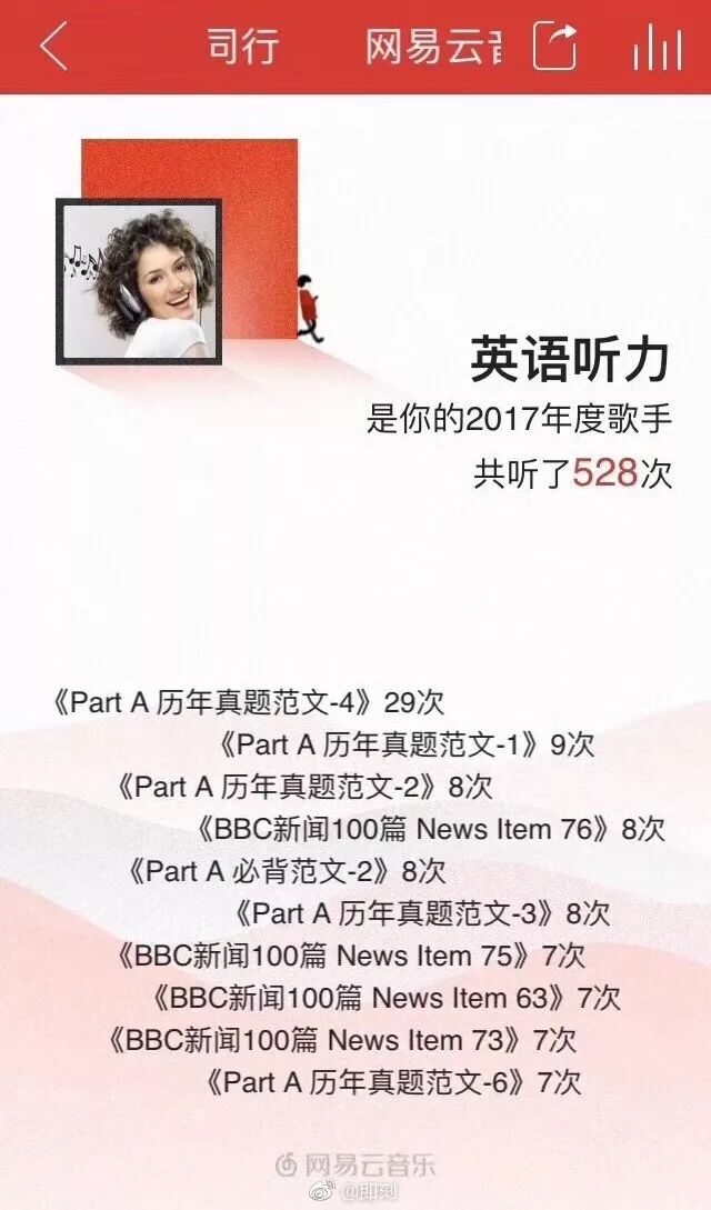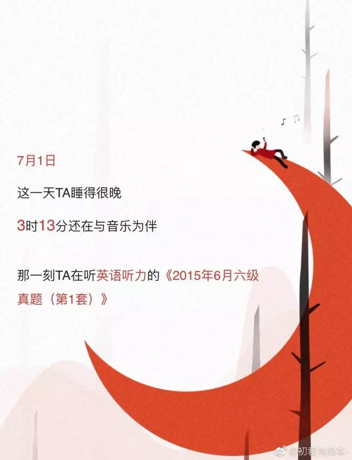 @M沈卿:今天朋友圈被网易云年度听歌报告刷屏,我只想说,美团饿了么百度糯米大众点评请不要这样。 我不想看到“这一年你一共点了多少次外卖”也不想看到 “XX天你睡得特别晚 半夜三点了你还在点外卖” “2017年你最爱的外卖是XXX”