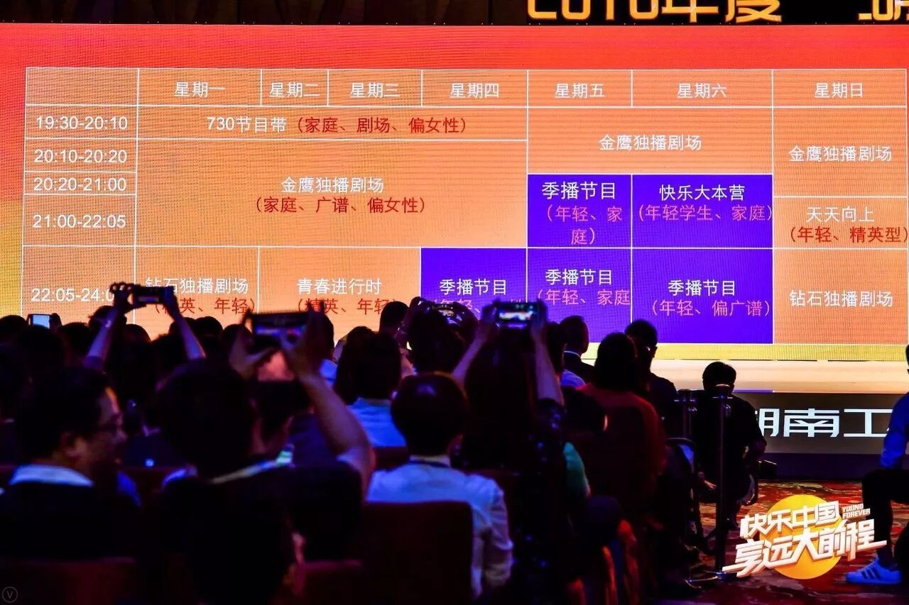 在品类盛典活动方面,重大节庆经典晚会《跨年演唱会》《小年夜春晚》、《全球华侨华人春晚》、《元宵喜乐会》、《中秋之夜》,加上优质资源国字品牌《金鹰节》、《汉语桥》、《年度顶级IP盛典》,各种优质资源将强力整合,牢牢锁定核心用户。与此同时,湖南卫视打造的主题化、活动化、多元化和系列化“年度品牌立体活动矩阵”将全新推出《毕业狂欢夜》、《明星运动会》、《时尚盛典》、《全民跑步节》等不同品类的晚会、活动。
