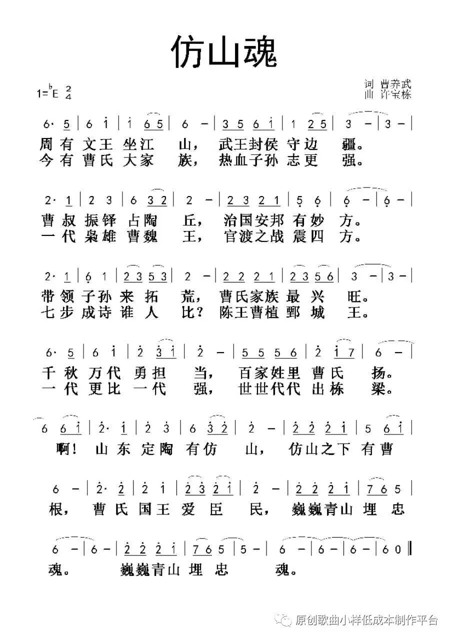 原创歌曲300元低成本制作 谱曲:100元 编曲:100元 演唱:100元 联系微信:15231653315 《仿山魂》 作词: 曹养武 作曲:许宝栋 编曲:古今 演唱:王艺涛 曹养武,男,1967年8月25日生于山东鄄城曹氏庄园,1989年毕业于山东巨野师范普师班。现为山东省菏泽市音乐家协会词作家,代表作《中国姑娘——女排魂》荣获2017年全国打工春晚一等奖,,《相聚延安》已报送陕西省文化厅《我的家乡是陕西》征歌组委会,已发表歌曲二百余首。 |