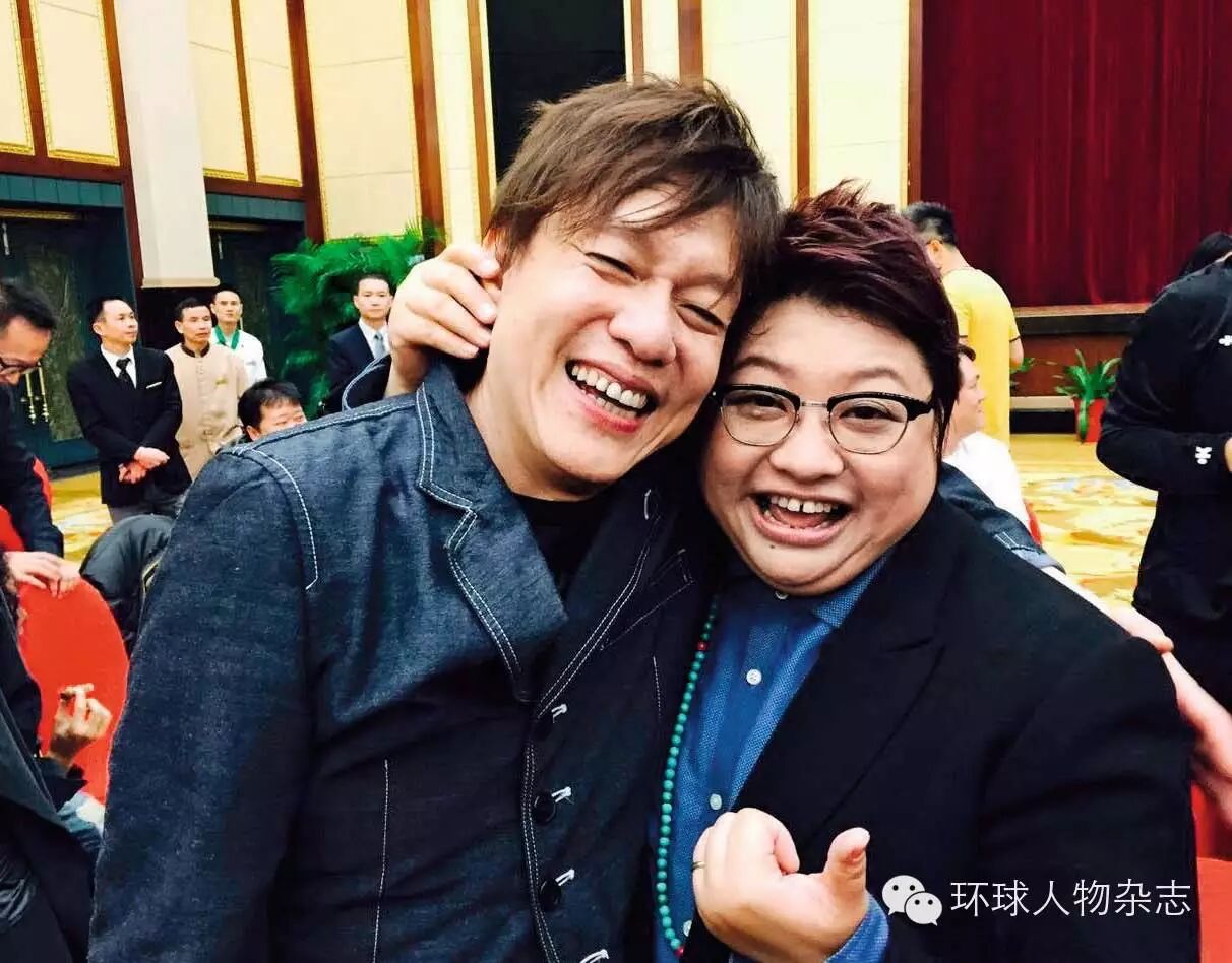 《我是歌手》第三季庆功宴现场,梁翘柏与韩红合影。
