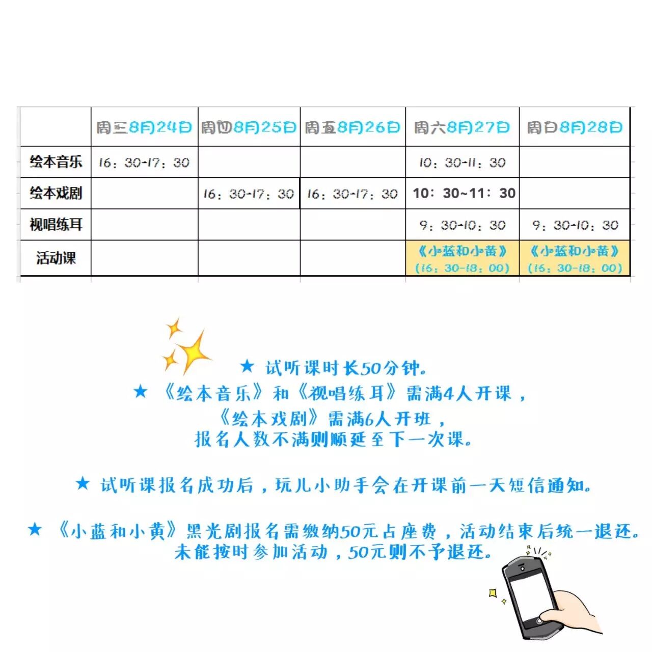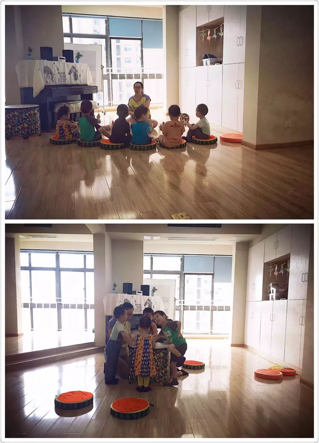 【绘本音乐】根据孩子们的年龄,按照春夏秋冬四季编排课题。这两周的试听课,派妈为3-4岁孩子们准备了“西瓜”这个主题。课程的学习重点是感受全音符,二分音符和八分音符的时值,运用音画一体的方式感受不同的时值,学会正确使用铃鼓,三角铁和响板表现不同时值。刚才还吵闹不停的教室,当派老师翻开绘本,孩子们立刻安静下来,纷纷搬着小西瓜坐垫,围坐在派老师身边,认真的听着绘本故事。3-4岁孩子的特点就是“坐不住”,派老师也有妙招,拿出小乐器,和孩子们一边唱着西瓜歌,一边跟着音乐打节奏。在轻快的歌曲声中,孩子们亲手制作“好吃的西瓜”,画上籽儿,一块又大又甜的西瓜送给爸爸妈妈!同样的课题,4-5岁的孩子们又有不一样的玩儿法,和派老师一起敲大鼓。咚咚咚,一阵乱打,在老师的引导下开始慢慢的找到节奏,合奏出好听的西瓜歌。当天的体验课上有一位2岁9个月的球球,第一次单独上课,球球的爸爸妈妈在教室外面很是紧张。可小球球专心上课的模样,和超强的语言表达能力,一点也输大哥哥们,课后派老师说“球球肯定是喂绘本长大的孩子。”两轮试听课下来,派老师发现孩子们对小鳄鱼的担心,担心西瓜籽在肚子里会变大,担心耳朵里会冒出西瓜藤。还发现孩子们通过吐西瓜籽的方式,感受到节拍时值的长短,并用身体,乐器表现出来,这就是我们的【绘本音乐】。有妈妈发现,在上课的过程中,派老师好像并不要求孩子们做什么,也不教孩子们怎么做,甚至有的孩子已经满场奔跑。可耐心的派老师总是能按照自己的方式控制课程节奏,到后来,所有的孩子都会不由自主的靠近老师,跟随着老师的节奏,进入【绘本音乐】的世界中。这就是我们的妈妈老师,她们不仅懂绘本懂音乐,更懂孩子。本周试听课继续开放预约,不仅有绘本音乐,还有绘本戏剧,视唱练耳,以及我们的《小蓝和小黄》,扫码即可报名!?
