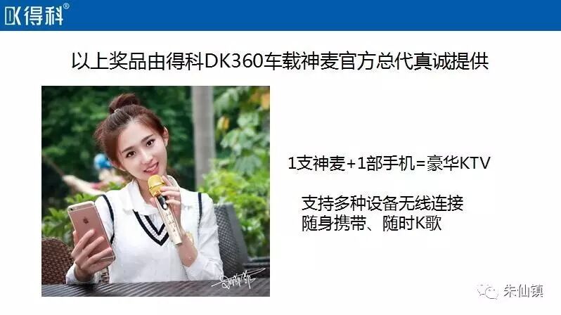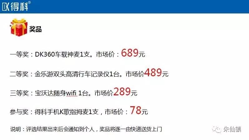 3、朱仙镇全民K歌活动参与者都有机会获得由得科DK360车载神麦官方总代提供的丰厚奖品。获奖选手奖品将通过快递的方式直接送到您的手中!
