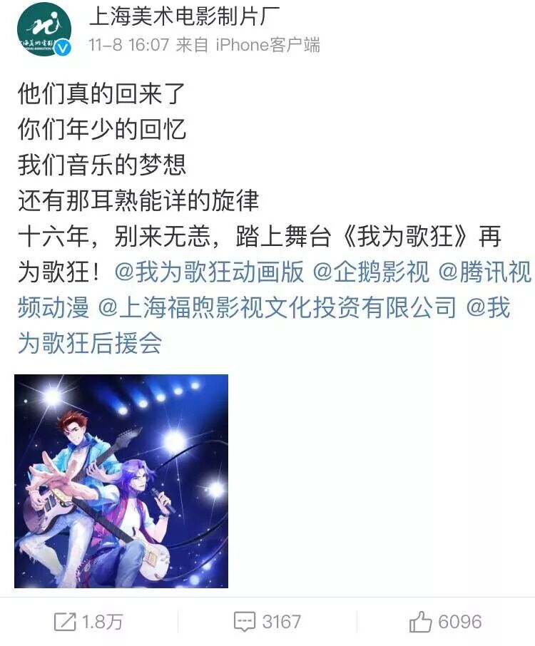 ▲16年后,上海美术电影制片厂正式宣布将制作《我为歌狂2》,尘封已久的记忆一下子被唤醒!
