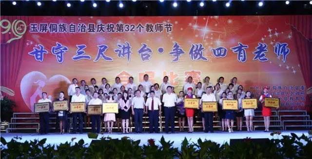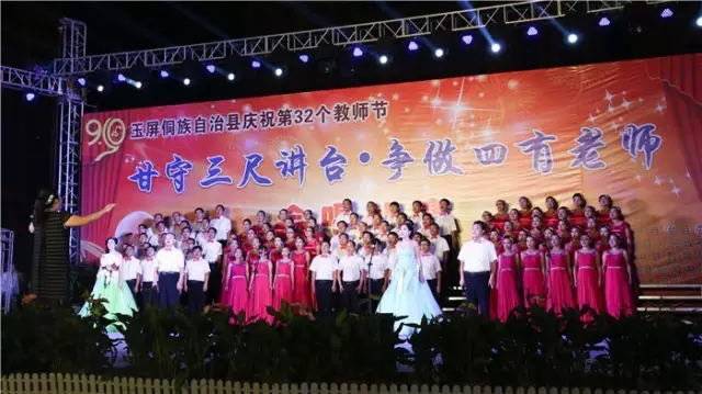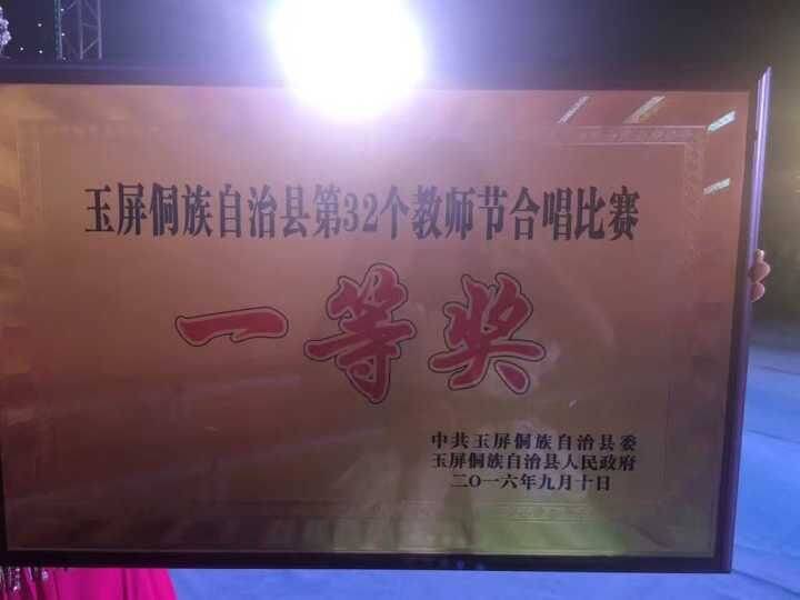 教师节前夕,贵州省玉屏民族中学教师合唱团以唯一的一曲《教师颂》,荣获玉屏县第32届教师节教师合唱比赛一等奖。贵州省玉屏县教师节教师合唱比赛由贵州省玉屏侗族自治县县委、县政府主办,第32届合唱比赛的主题为“感受三尺讲台,争做四有教师”。