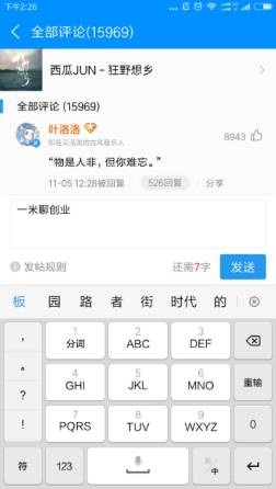 在听菜单中随便找一首歌曲,比如我播放的西瓜的歌曲《狂野想乡》,然后歌曲播放之后再歌曲的下方有个评论区,在这里可以对这首歌进行评论,但是我不建议大家发硬广,因为可能会被系统给删除,所以保险起见,简短干练。