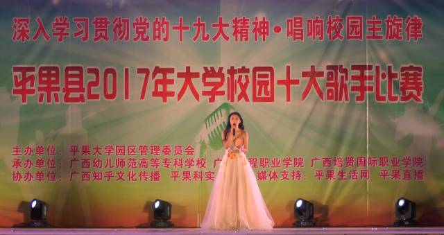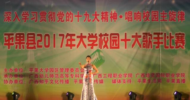 2017年12月1日晚,平果大学园区管委会在广西工程职业学院举行“深入学习贯彻党的十九大精神,唱响校园主旋律”为主题的“平果县大学校园十大歌手比赛”。来自广西幼儿师范高等专科学校、广西工程职业学院和广西培贤国际职业学院18名进入总决赛的选手参加了角逐。经过紧张的比赛,确莫尔子等10名选手获得了“平果大学校园十大歌手”的荣誉称号,另外三名选手分别获得了“最具人气奖”、“最具台风奖”和“最具潜力奖”。