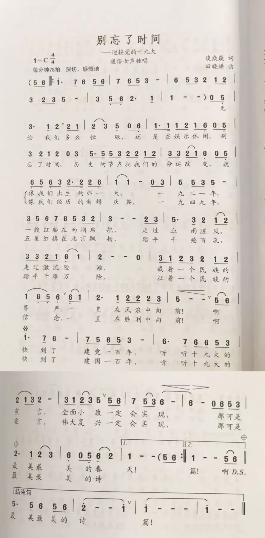 “建党一百年,听听十九大的宣言,全面小康一定会实现,那可是最美的春天。建国一百年,听听十九大的宣言,伟大复兴一定会实现,那可是最美的诗篇……!”歌词情真意切,旋律优美流畅,深情表达了对党的十九大胜利召开的喜悦之情,弘扬了主旋律,传递了正能量。