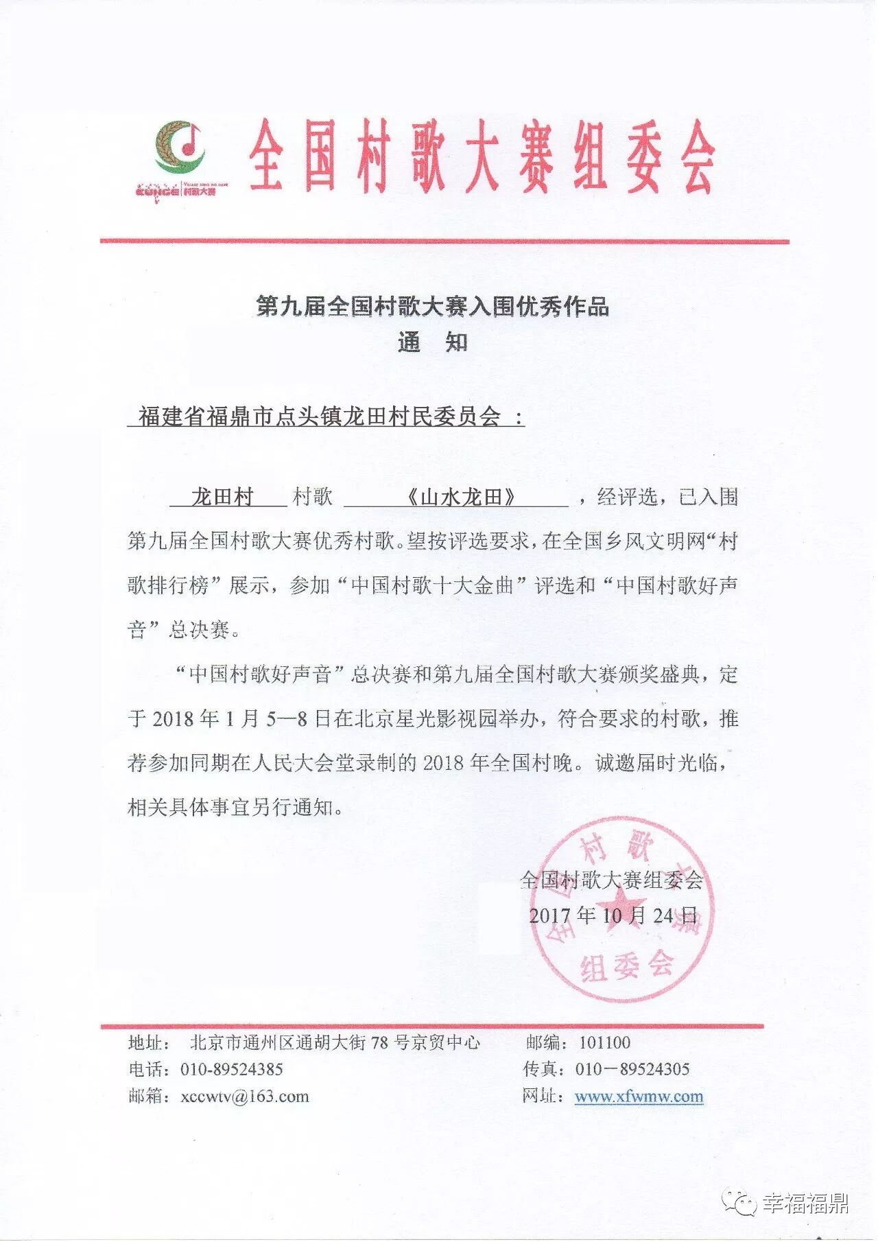日前,福鼎乡土原创音乐人创作歌曲《山水龙田》被第九届全国村歌大赛筹备组评为优秀村歌,并受邀于2018年一月份前往北京星光影视城参加第九届全国村歌大赛总决赛、。