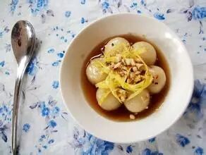 “糖不甩”做法简易,直接把糯米粉煮熟,挪搓成粉丸,在铁锅中用滚热的糖浆煮熟,然后撒上碾碎的炒花生或切成丝的煎鸡蛋伴食。