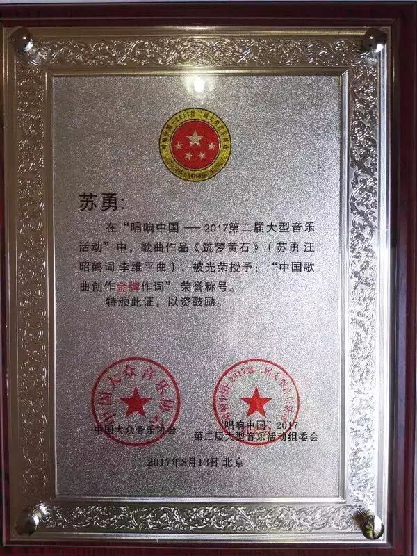 8月13日,《筑梦黄石》在北京参加“唱响中国——2017第二届大型音乐活动”,被活动组委会授予“中国歌曲创作金牌作词”荣誉称号;另外,苏勇、汪昭鹤作词,李维平作曲,为省运会创作的《相约黄石》,被授予“中国歌曲创作金牌作曲”荣誉称号。
