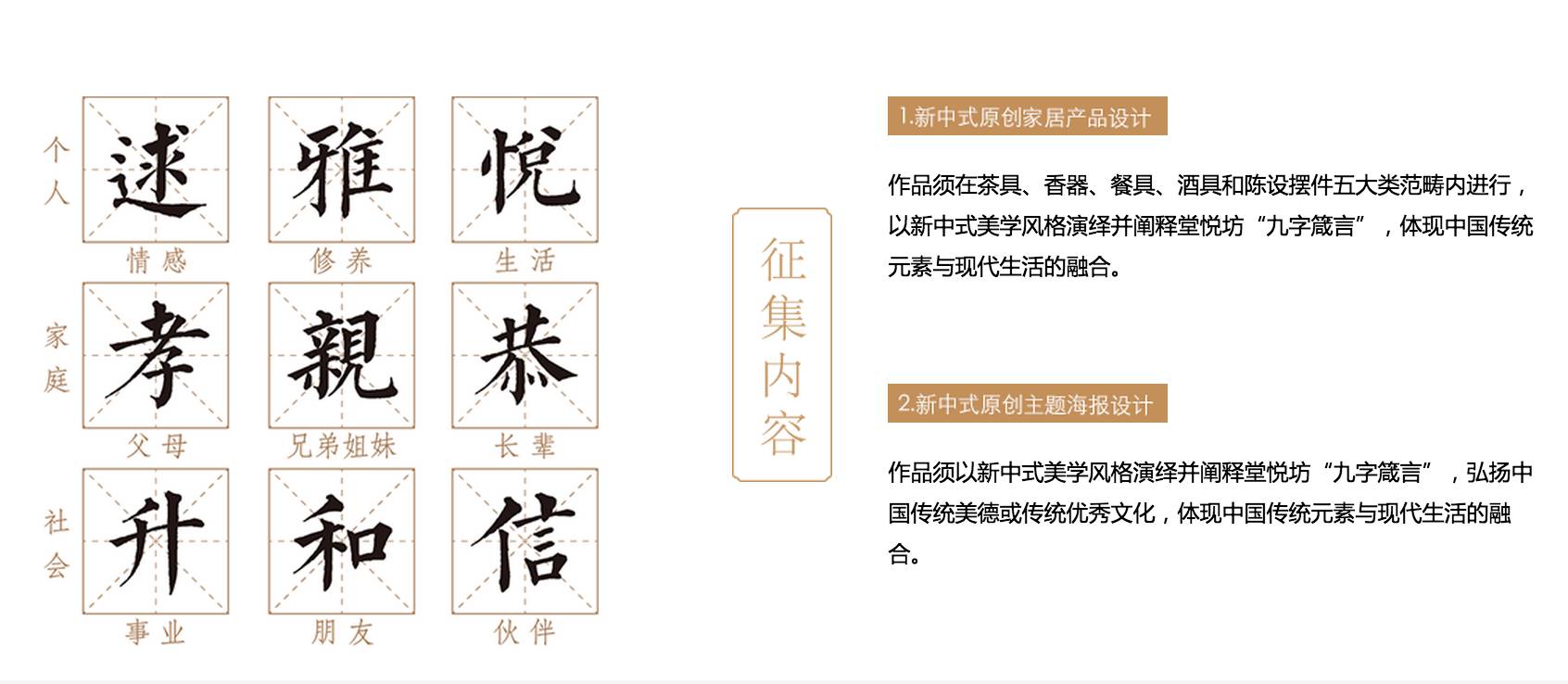 作品须以新中式美学风格演绎并阐释堂悦坊“九字箴言”,弘扬中国传统美德或传统优秀文化,体现中国传统元素与现代生活的融合。作品可在”九字箴言“九字中的任一字上进行延展。(“九字箴言”:逑、雅、悦,孝、亲、恭,升、和、信。详情请参考堂悦坊官网—明理文化:http://hometang.cn/w79466.jsp)