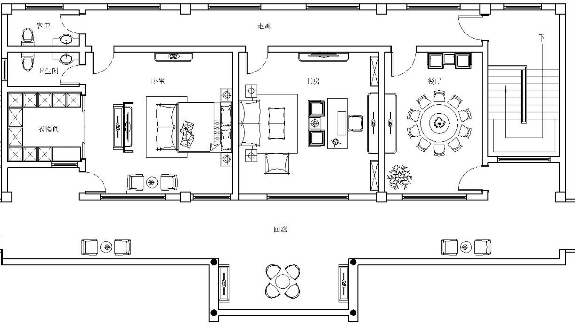 本方案延续配楼原设计方案的感觉,鉴于空间较大,采用比较厚重的传统中式木结构顶面的元素结合现有房屋结构进行设计,同时融入光影的效果,解决了传统中式的沉闷感。整个空间材质以深色稻草泥为基础突出了淳朴的感觉。通过点光源照明营造休闲放松的空间氛围。硬木类家具突显空间品质,软装配饰方面增添色彩装饰,绿植摆放增添趣味性。