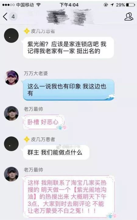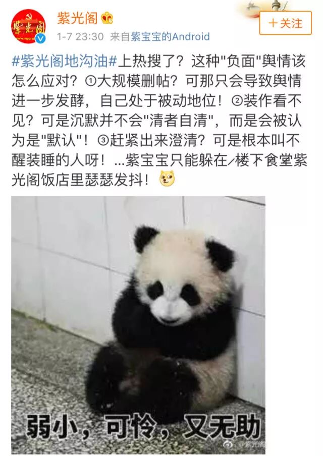 然后“”紫光阁地沟油“真的上热搜了,可怜的紫光阁只有在微博上无奈回应:宝宝只能躲在紫光阁饭店里瑟瑟发抖 。