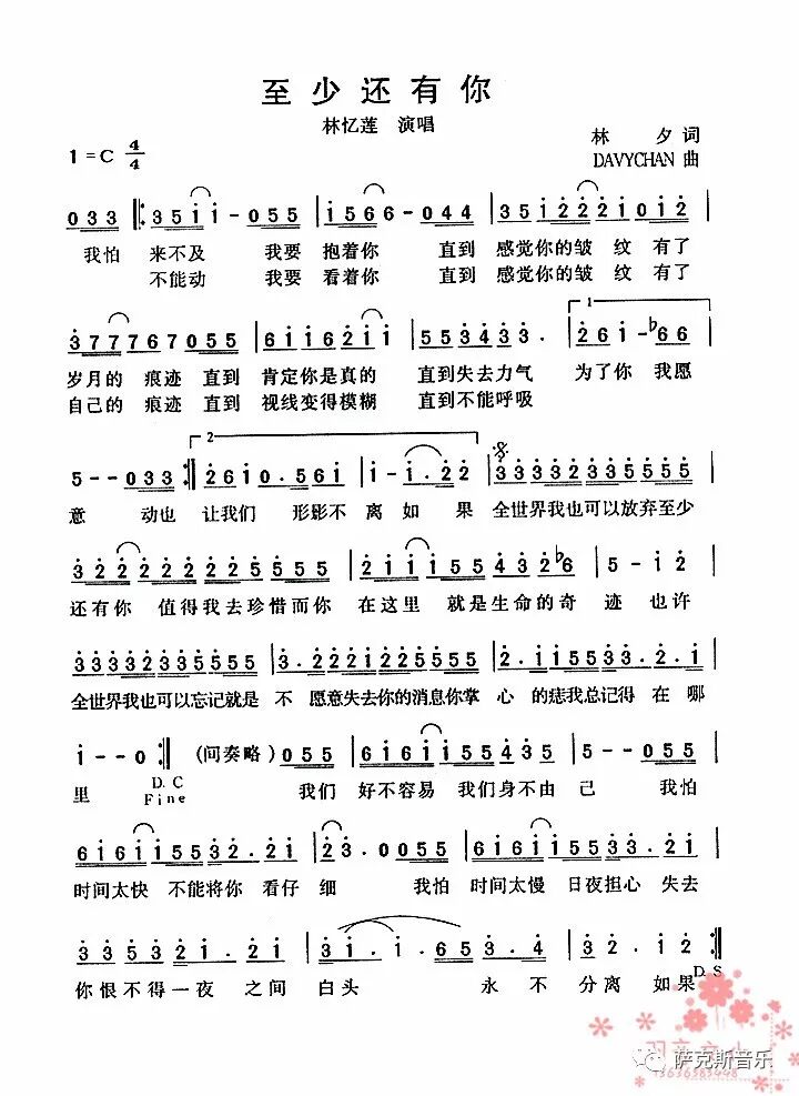《至少还有你》的歌词,写的是两个人相爱的感受。歌曲低婉吟转,听来令人悲悲切切却又心旷神怡, 缠绵悱恻的歌声唱出了千回百转的爱情。歌曲温暖而又细致,是一首预言歌,也是唱给生命中的另一条伏线;是聪明的选择, 也是一种相互信任的态度。