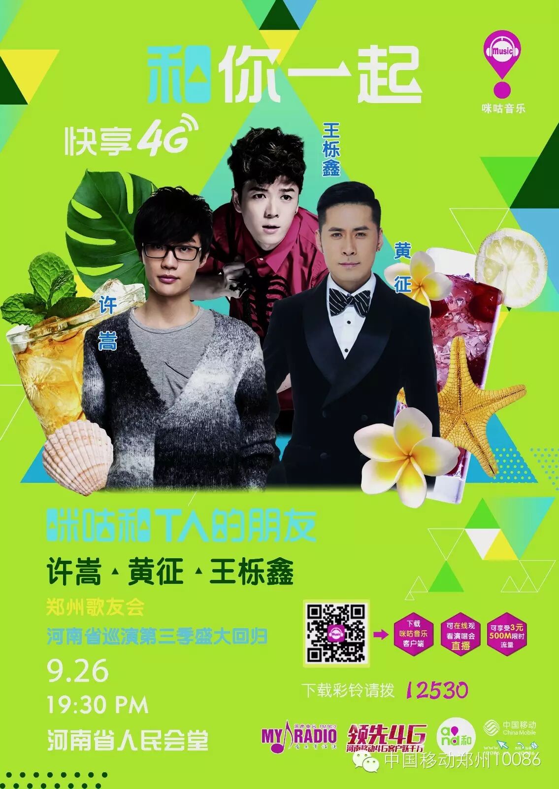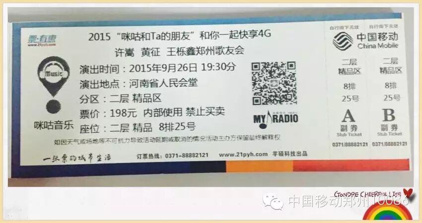 【抢票方式】:活动期间,下载飞信、139邮箱、和通讯录、和彩云、上网管家、掌上营业厅、MM商城、咪咕音乐、和阅读、和动漫客户端,并发送您使用中的截图及手机号到“中国移动郑州10086”官方微信,即可参与抢票哦~