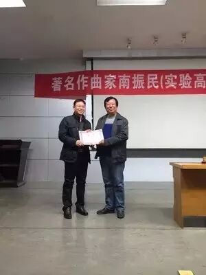 2月28日,著名作曲家南振民歌曲创作讲座在我校成功举办,我校音乐专业全体师生参加了这次活动。会上校长雷建卢为南振民颁发了实验高中特邀客座教授的聘书。