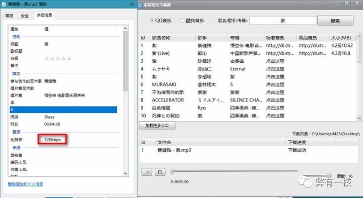 搜索到自己想要下载的音乐时,则可以选择音质并进行下载,最大支持320kb高品质音质,十分不错。