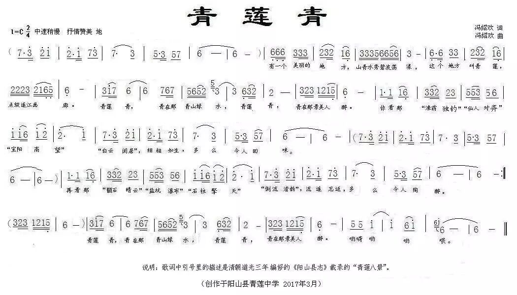 最后再次用第二乐段结束歌曲,强调歌曲主题“青莲青,青在那青山绿水、景美人醉”上,加上最后一乐句词曲似向着磅礴而又秀丽的刚山柔水和被陶醉的人们打招呼:“哟—嗬—哟—哟嗬喂—”,表达了“对青莲的高度赞美与依依不舍之情”。(作者简介:冯绍欢,青莲中学校长,其所创作的原创歌曲曾在2016年清远市首届“村歌嘹亮”原创歌曲歌唱大赛获“最佳原作曲奖”。