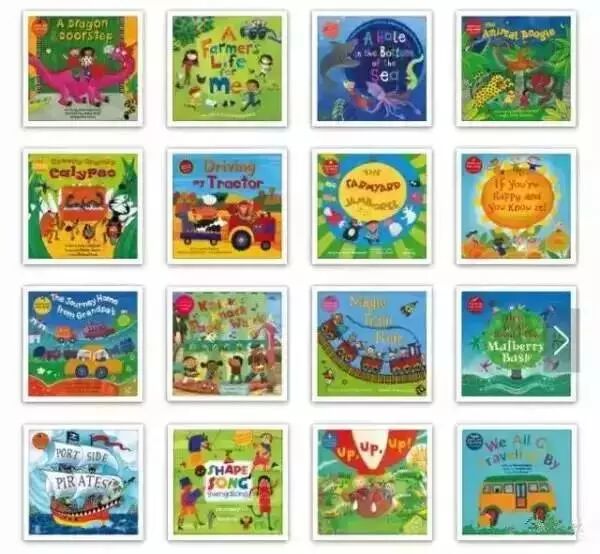 这套书共8册,其中6册都曾于2010年高踞英国亚马逊童书榜。这的确是很罕见的。相应的8首歌由美国著名的民谣歌手演唱。歌声快活、节奏感强,对情景的把握活灵活现,还夹有自行车的铃铛声、小朋友的笑声、动物的叫声等等有趣的声音。