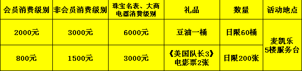 活动期间,顾客持新玛特、麦凯乐两店单张水单现金消费满额送不同级别礼品,各级礼品不兼得,单张水单限领一份。(黄金饰品、租赁店铺、超市、餐饮不参加活动)