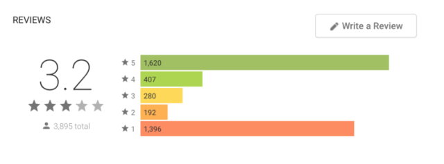 在Google Play商店的评分:3.2分,不算高。并且它的评分统计看起来很极端:要么1星,要么5星。不过它的热度很高,不到一天的时间已经有3800多条评价。其中低分评价多是不满意安卓版的各种Bug,例如机型不匹配、软件崩溃等。高分评价用户则是表示庆祝,又一个新的苹果应用来到了安卓市场。