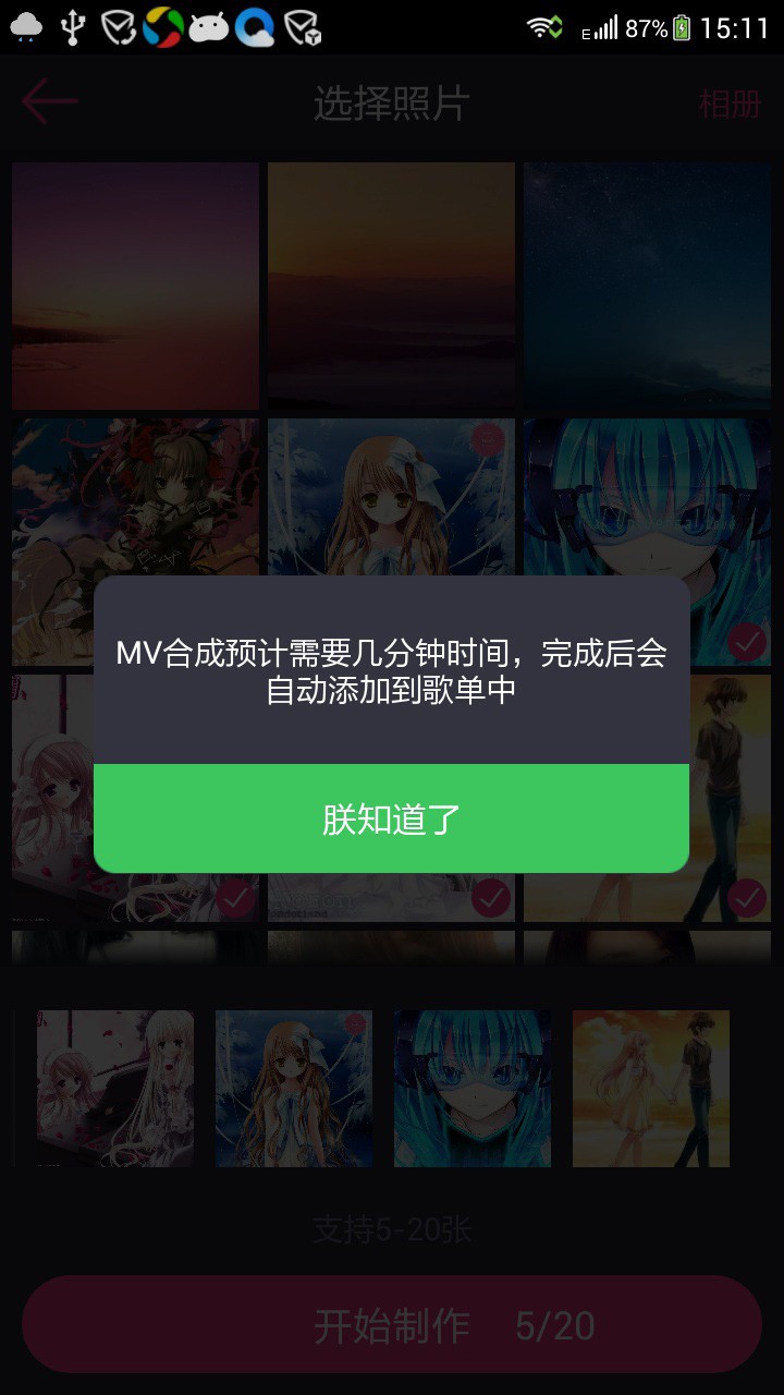 第七步:照片放5-20张,选好后点击“开始制作”,MV合成需要几分钟的时间,为了防止MV制作失败,希望耐心等待,完成后会自动添加到歌单中