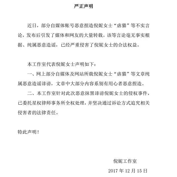 昨日,倪妮工作室也发表了严正声明,称这些造谣虐猫的言论已经严重侵害了倪妮的合法权益,坚决通过诉讼方式追究相关法律责任。
