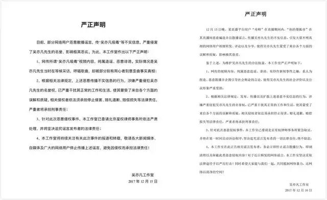 之后从昨晚到今天凌晨吴亦凡工作室连发了两条声明怒斥谣言,并声称将以法律的手段予以严厉打击,坚决抵制网络暴力,绝不姑息。