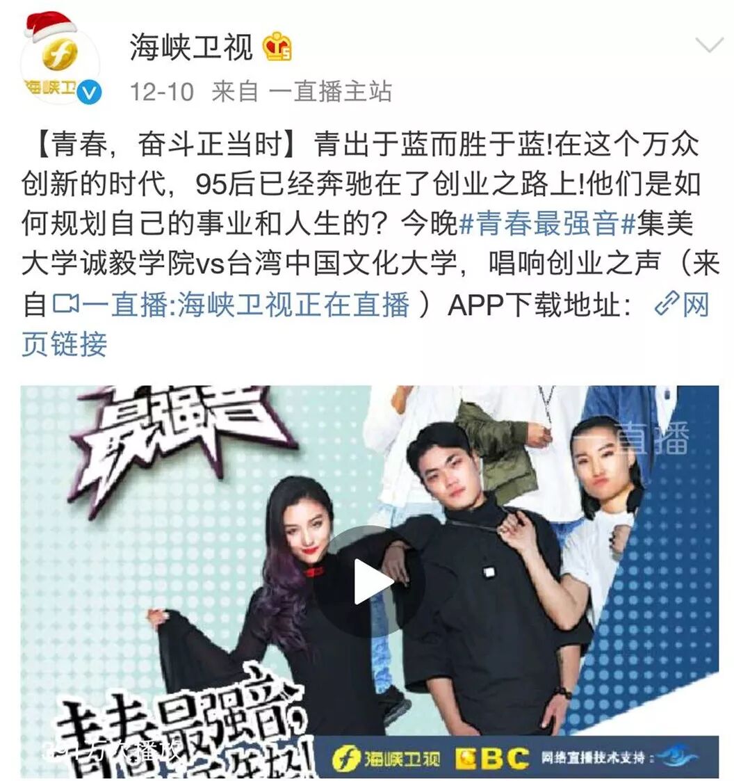 1、关注海峡卫视官方微信公众号,点击“最强音—两岸校际决赛”进入直播