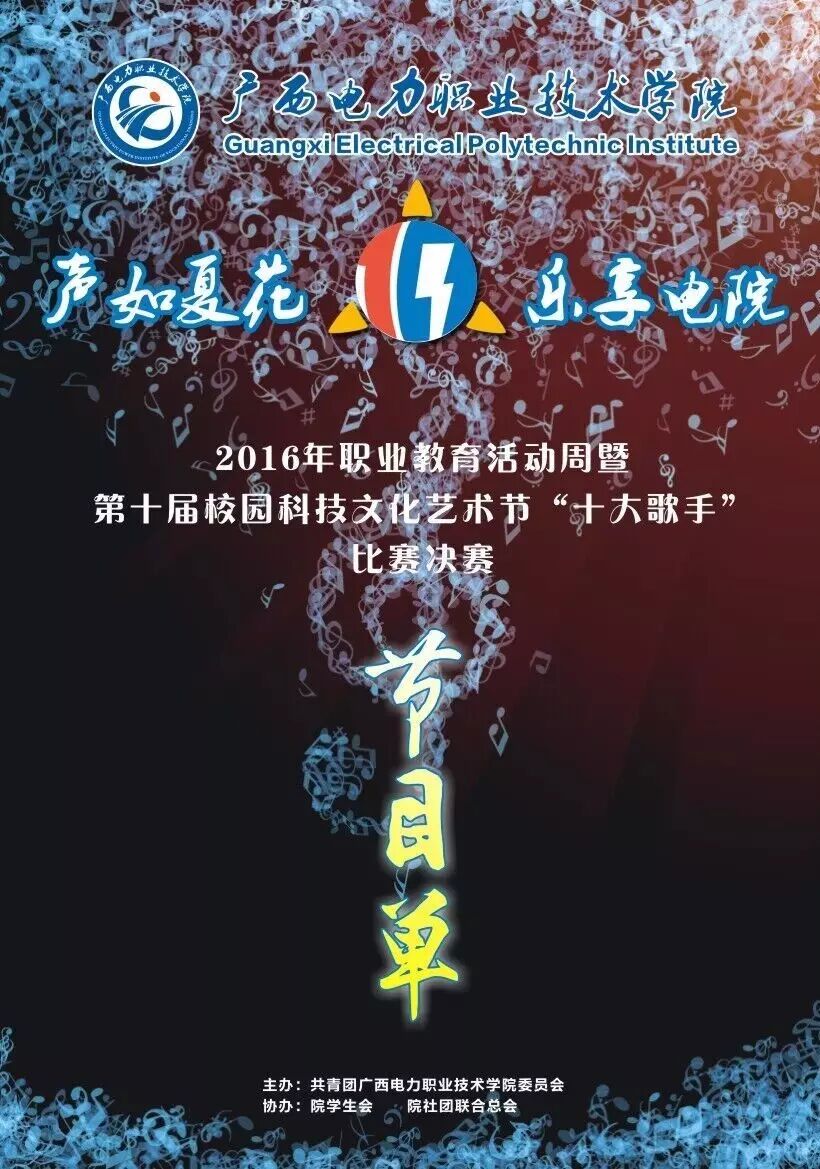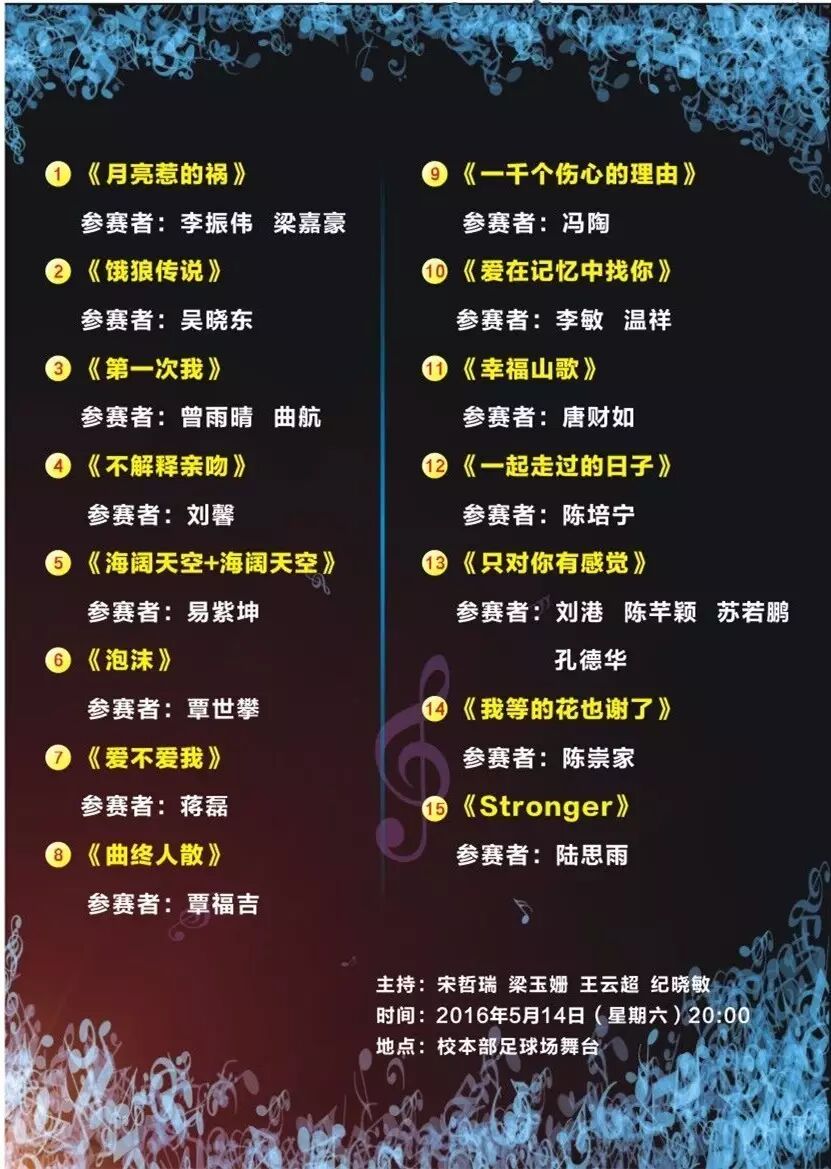 口口万众瞩目的我院2016年职业教育活动周暨第十届校园科技文化艺术节“十大歌手”比赛决赛歌单新鲜出炉啦~小青星不是剧透哦,小青星只是预告一下而已,特推出“十大歌手”比赛决赛歌单,绝对会让你眼前一亮!这般精美的歌单再配上各位歌神精彩绝伦的演唱,你们是否也和小青星一样既期待又紧张呢?
