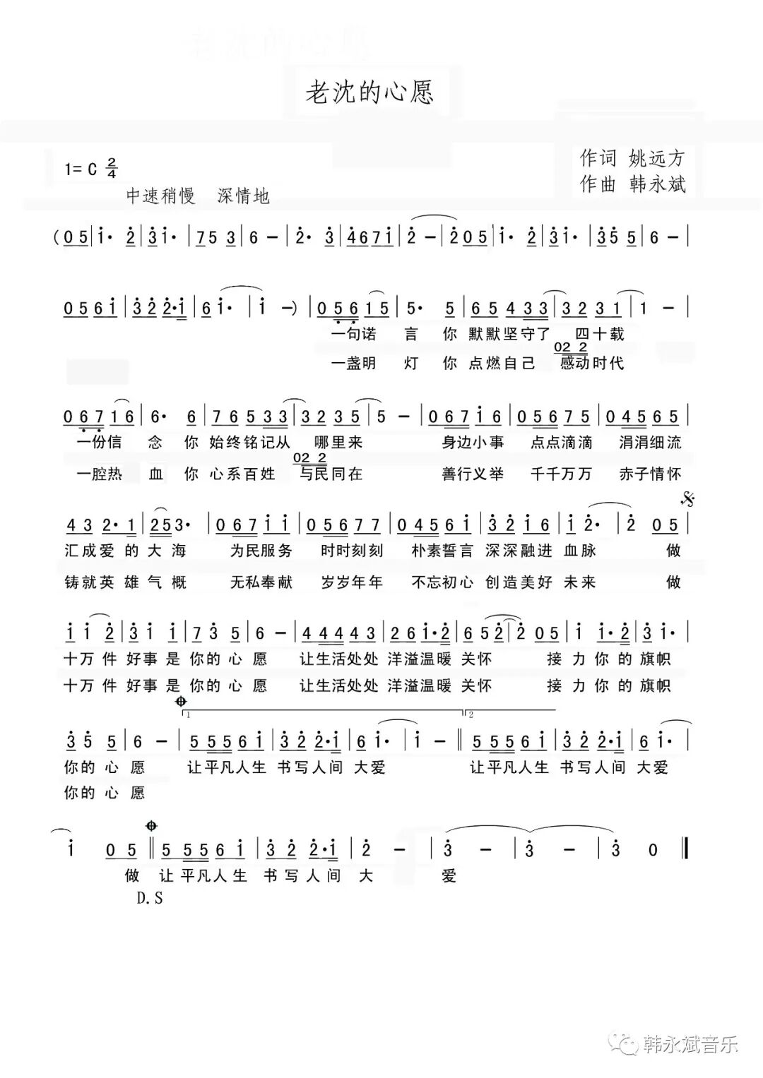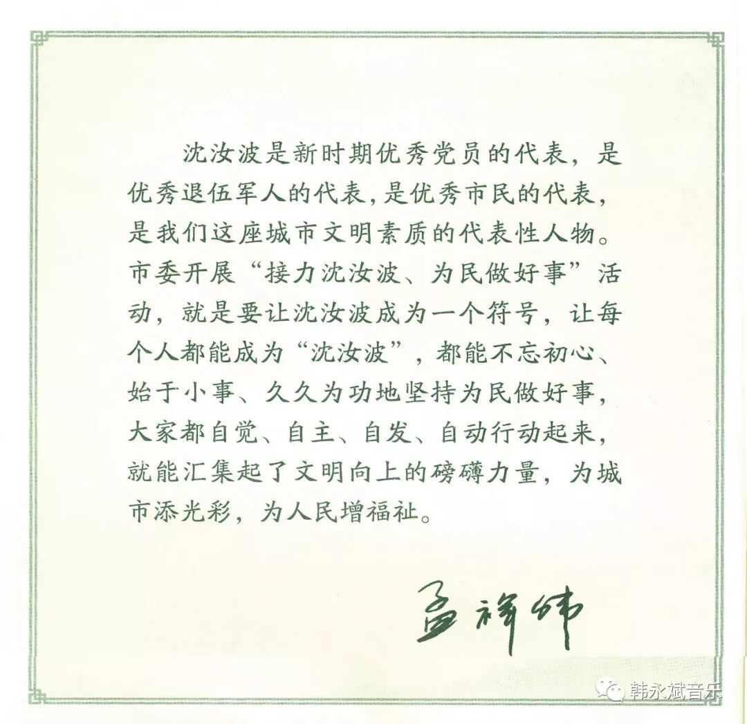一首由姚远方作词,韩永斌作曲,专门为新时代活雷锋——沈汝波创作的歌曲《老沈的心愿》,真挚动人,充满了正能量,愿好人故事人人传颂,好人精神代代相传,愿“接力沈汝波,为民做好事”成为新时代的时尚和习惯。