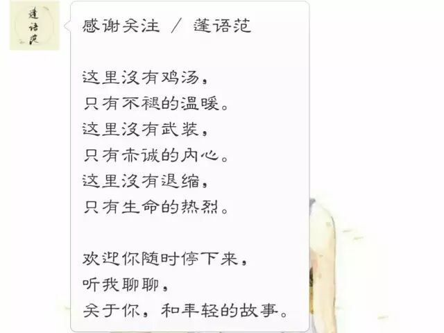 既然选择了创造一个与自我对话的空间,选择了用文字去遇见有共鸣的人,既然已经拥有了关注【蓬语范】的你,我们没有理由不坚持到现在。