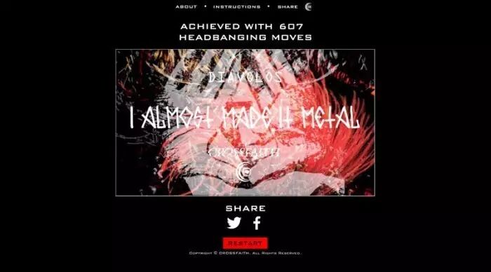 Make it Metal网站是Crossfaith乐队为宣传最新EP《Freedom》制作的互动站点,它能够用网络摄像头纪录你在听乐队音乐时的甩头活动,一首歌曲完毕后,网站会向你显示专辑封面以及甩头数量的统计结果。
