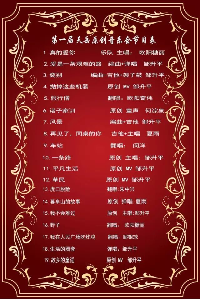 原创音乐人邹升平将带着十余首已发布和未发布的原创作品,以耳目一新的方式登场,本地实力唱将朱中兴、闵洋、欧阳奇伟、欧阳糖丽、邹银球、本地音乐人夏雨及其学生亦将献上精彩的表演。