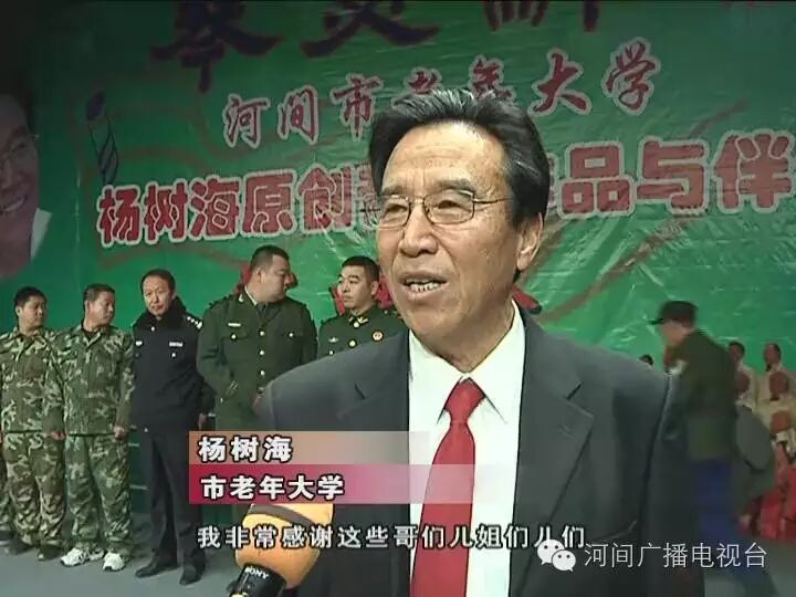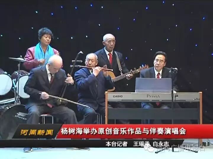 11月9日,杨树海原创音乐作品与伴奏演唱会在市广播电视台演播大厅举行。来自老年大学的演员们表演了杨树海创作的《打工者之歌》《我们的校园》《胡琴颂》《河间太极队员之歌》等14部作品。