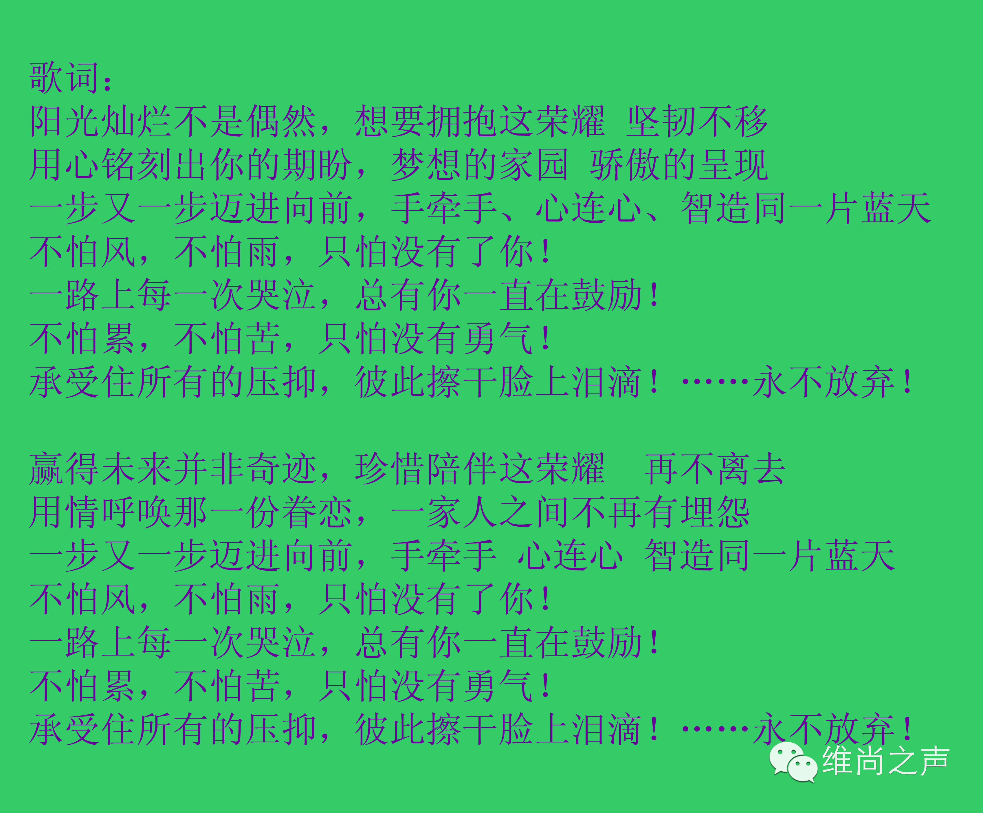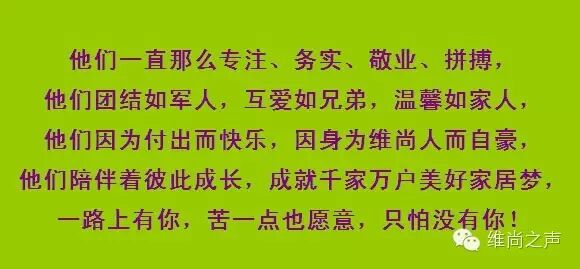后记:《只怕没有你》从黄振宁油然而生的情感而来,那是维尚人的品质给予他的。艾总监的“英明决定”与黎总为首的录制团队的努力,让这首歌在去年年会精彩呈现。希望2015,这首已经成为维尚之歌的《只怕没有你》,能在全体传唱下,将其精髓发扬,蕴含的维尚精神一直传承激励。