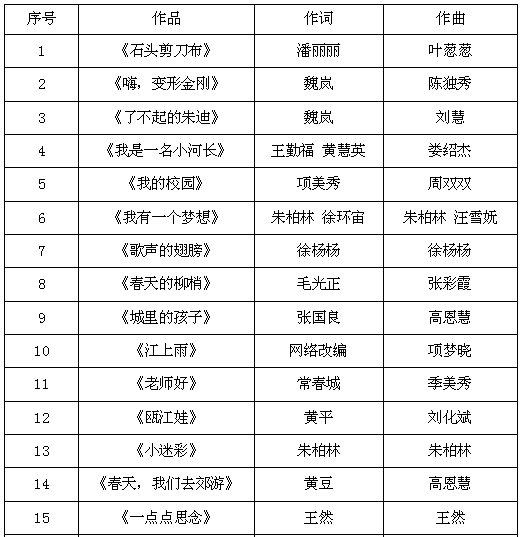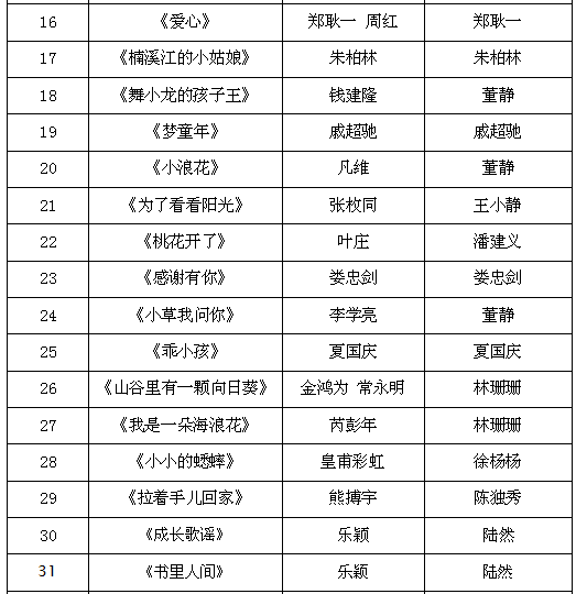 由温州市教育局、温州市委、温州市文学艺术界联合会联合主办,温州市音乐家协会承办、温州市音乐家协会儿童音乐学会执行承办的2017“温州市首届儿童歌曲创作(创作与演唱)大赛”正在如火如荼进行。本次大赛自启动以来,共收到来自各县(市、区)的原创作品61件,题材多样,风格多元。经过大赛专业评审团认真评选,共31个参赛作品入围,进入复评阶段。现将名单公布如下: